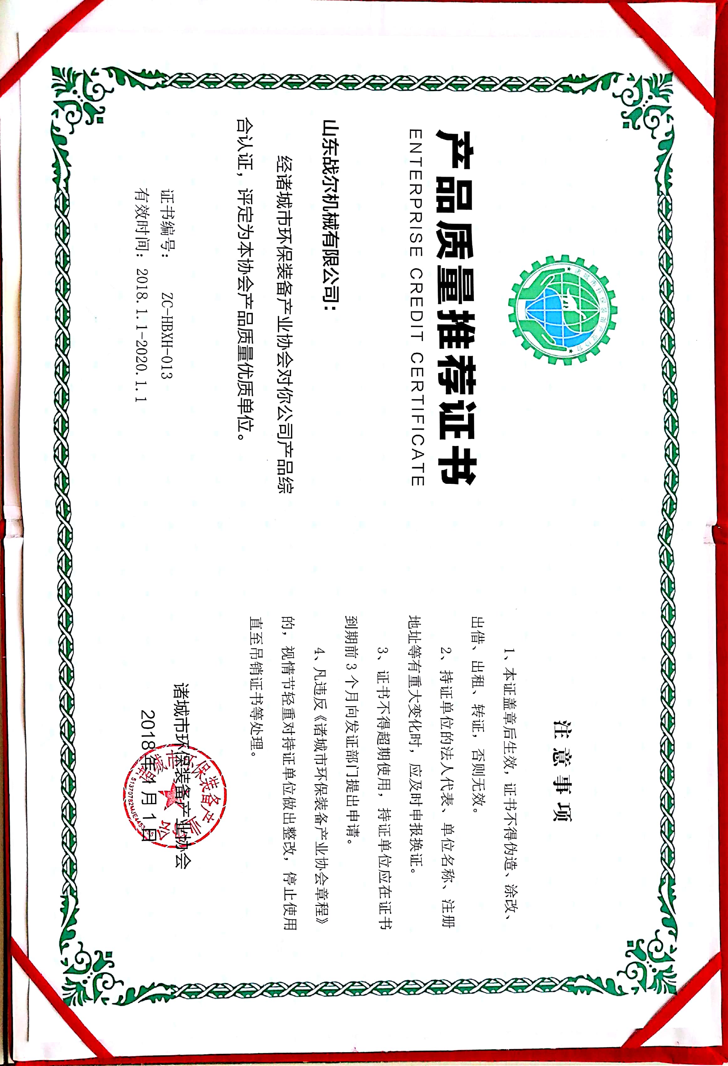 环保产业装备证书